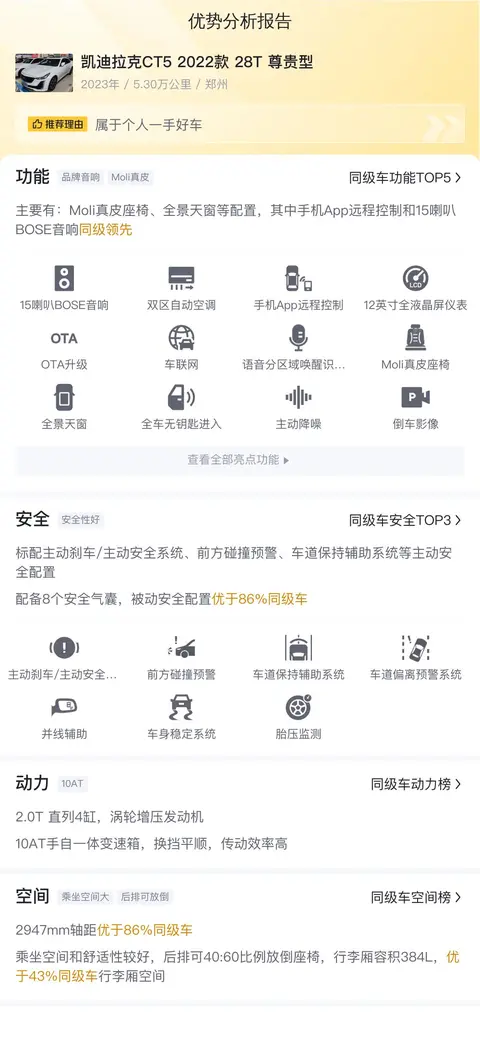 该车是凯迪拉克CT5 2022款 28T 尊贵型,上牌地为郑州,上牌日期2023年1月,表显里程5.3万公里,新车指导价32.07万,二手车报价17.38万,车身颜色白色,过户次数0次。支持分期购车,首付5.21万即可开回家。